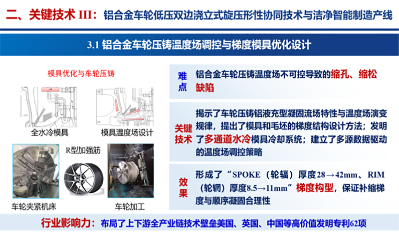 三是發(fā)明了鋁合金車輪低壓雙邊澆立式旋壓新方法,突破了形性協(xié)同導(dǎo)向的鋁合金車輪壓鑄智能溫控模具優(yōu)化技術(shù),構(gòu)建了鋁合金車輪潔凈切削自適應(yīng)工藝策略與智能檢測產(chǎn)線,提升車輪抗拉強(qiáng)度、延伸率,降低夾渣報廢率。