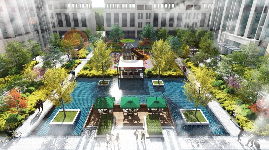景觀理念:大隱于市:"東方美學,貴雅之境"。在喧鬧、動態的城市中,以形式上的隱,真正達到擇隱山水,物我兩忘的心境。在快節奏的狀態中體驗向往的仙境,讓人心馳神往。三重院落:第一重商業區、第二重商辦區、第三重庭院區。汲取老北京四合院式的三進院落融入設計語言,同時是對古典文脈的一種延續,體現其東方神韻。