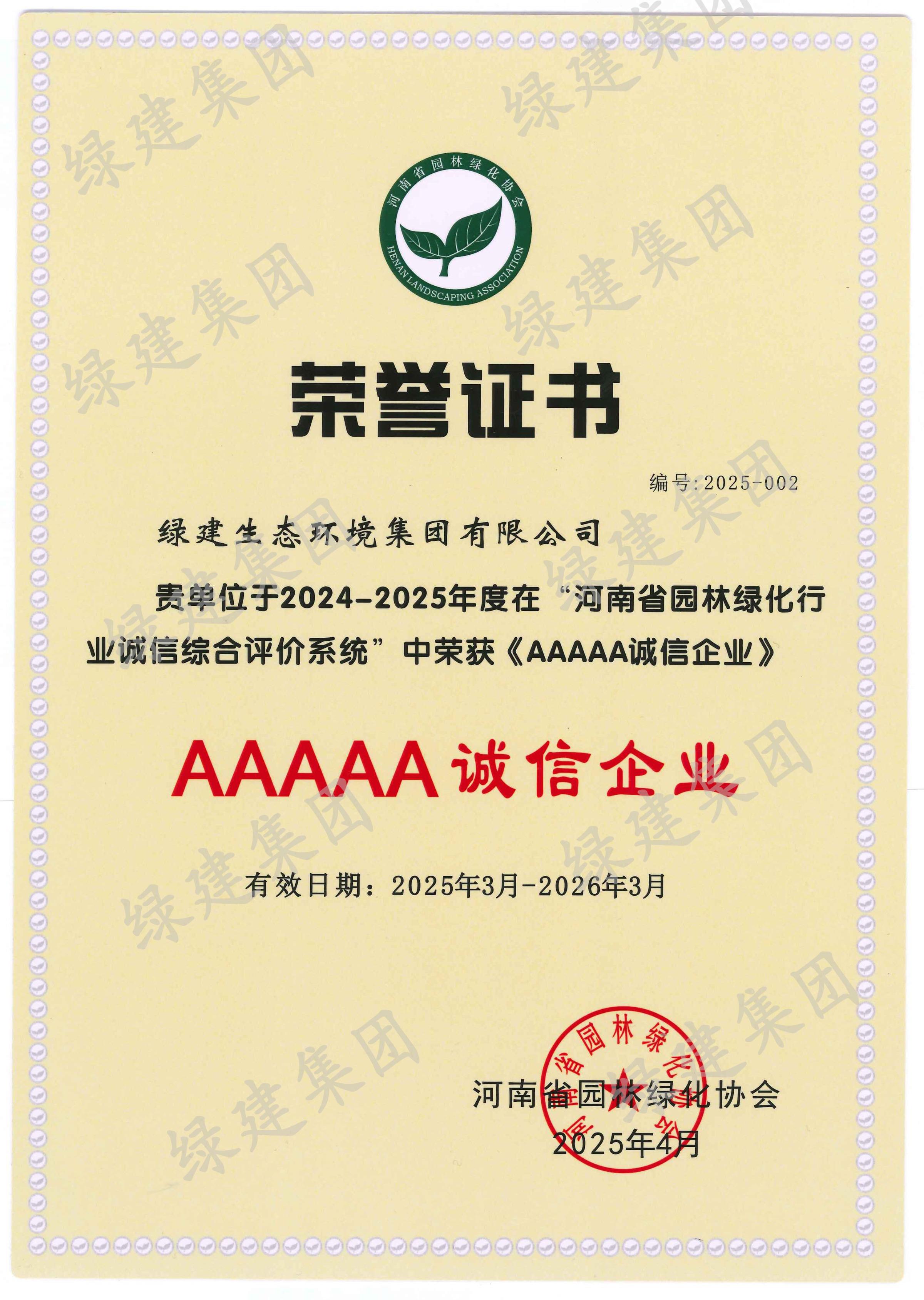 2024-2025年度河南省園林綠化協會AAAAA誠信企業