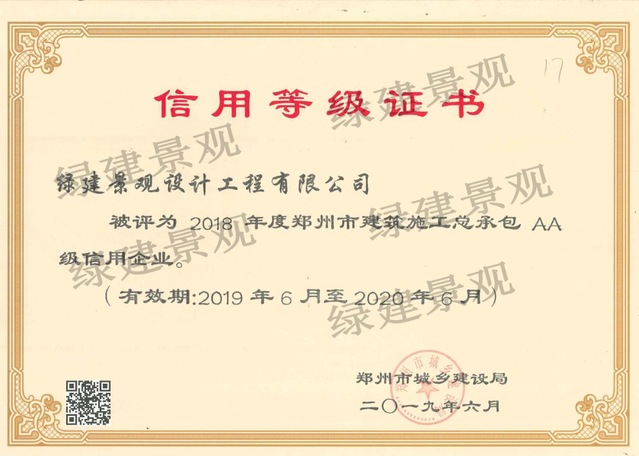2018年度鄭州市建筑施工總承包AA級信用企業
