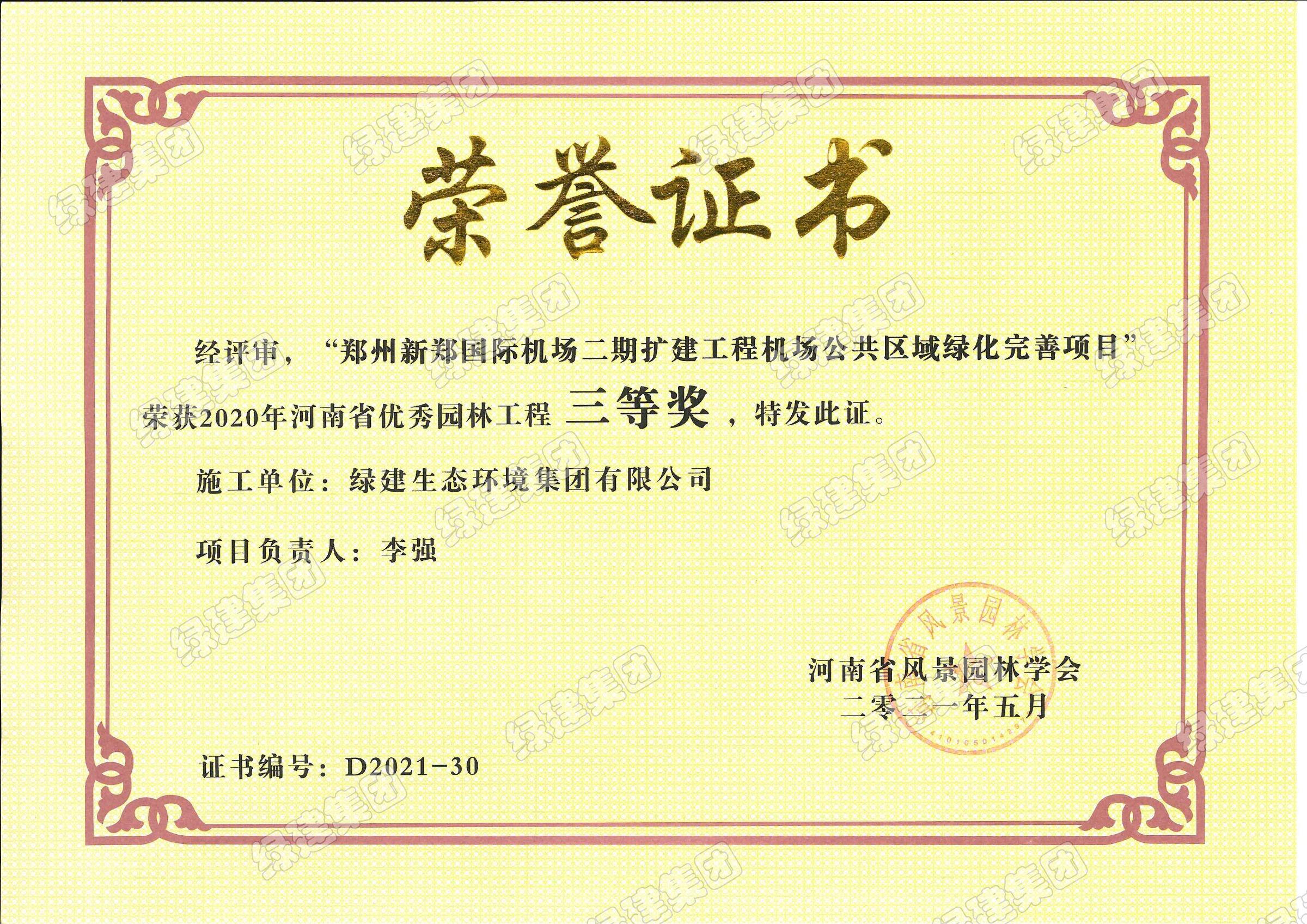 鄭州新鄭國(guó)際機(jī)場(chǎng)二期擴(kuò)建工程機(jī)場(chǎng)公共區(qū)域綠化完善項(xiàng)目——2020年河南省優(yōu)秀園林工程三等獎(jiǎng)